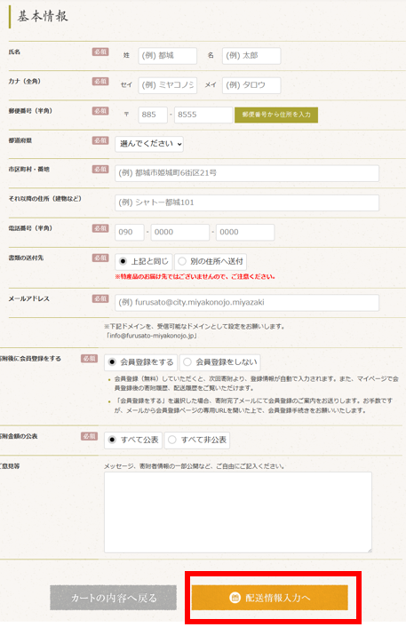⑪基本情報を入力してから「配送情報入力へ」をクリックします。
