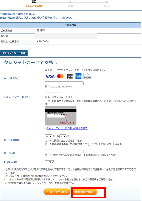 支払いするクレジットカードの情報を入力し、「確認画面へ進む」をクリックします。