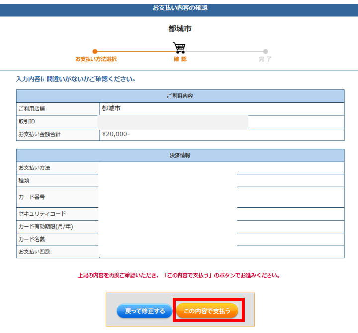 内容、決済情報を確認し「この内容で支払う」をクリックします。