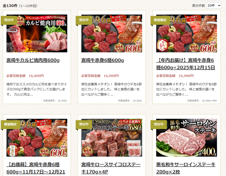 ふるさと納税の対象となる品目はとても多く、宮崎牛やお米、焼酎、地元の加工品など魅力的な返礼品が並んでいます。