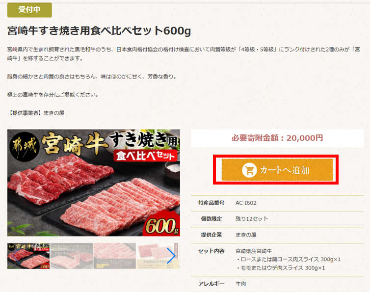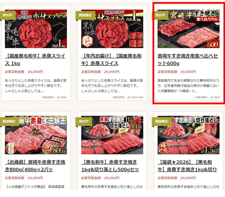 ⑤今回は食べ比べてみたいので、右上の「宮崎牛すき焼き用食べ比べセット600g」を頼んでみます!